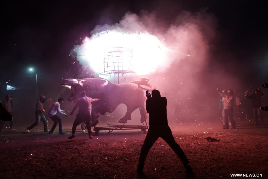 تولتيبيك 10 مارس 2025 (شينخوا) في الصورة الملتقطة يوم 8 مارس 2025، أشخاص يشاركون في عرض "الثور الناري" خلال المهرجان الدولي للألعاب النارية المُقام في بلدة تولتيبيك بولاية مكسيكو بالمكسيك. يتميز الحدث بعروض ألعاب نارية خلابة، إضافة إلى عرض "الثور الناري" التقليدي، حيث تُزيّن هياكل على شكل ثيران بالألعاب النارية، ما يعكس براعة الحرفيين وجاذبية الثقافة المرتبطة بفنون صناعة الألعاب النارية.