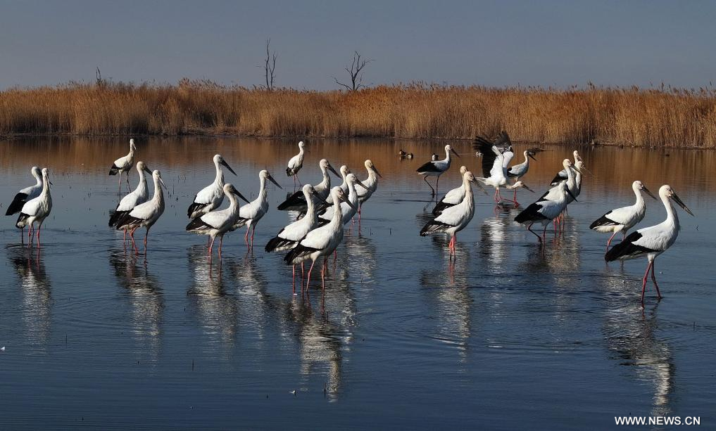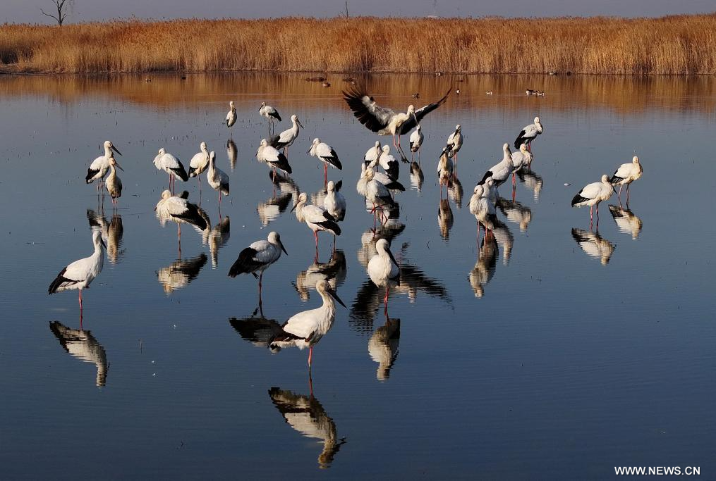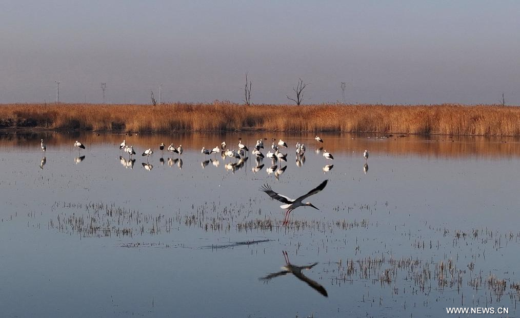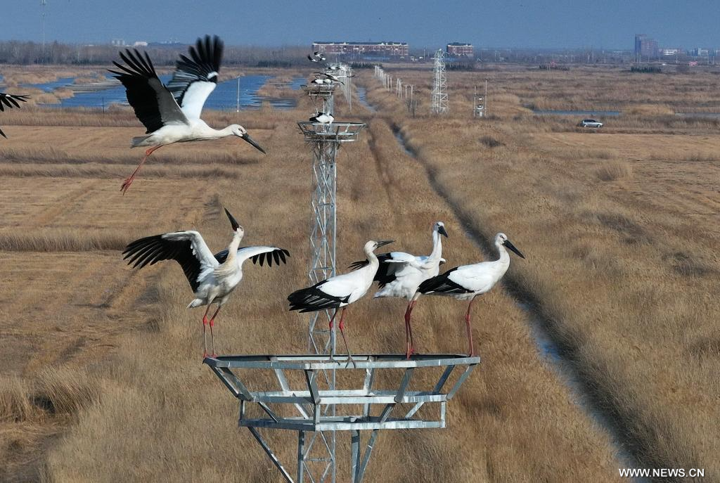 طيور اللقلق الأبيض الشرقي في أراضي تساوفيديان الرطبة بمدينة تانغشان في شمالي الصين