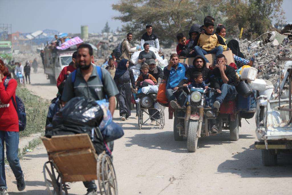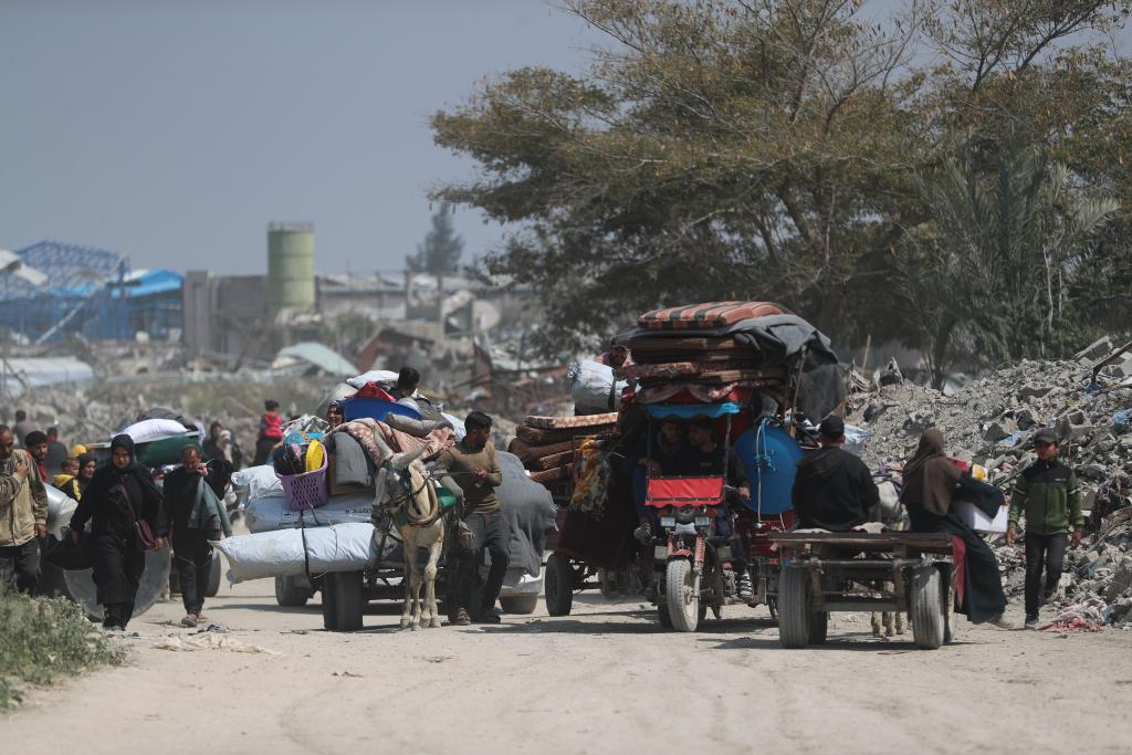 غزة 19 مارس 2025 (شينخوا) في الصورة الملتقطة يوم 18 مارس 2025، فلسطينيون على طريق في مدينة غزة يفرون من مدينة بيت حانون شمالي قطاع غزة.