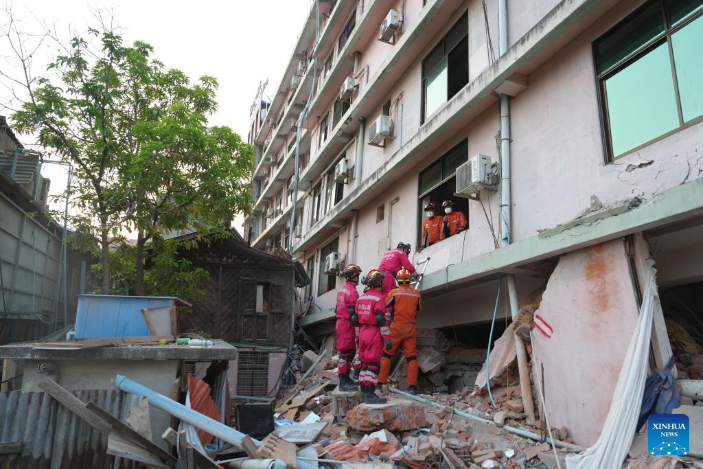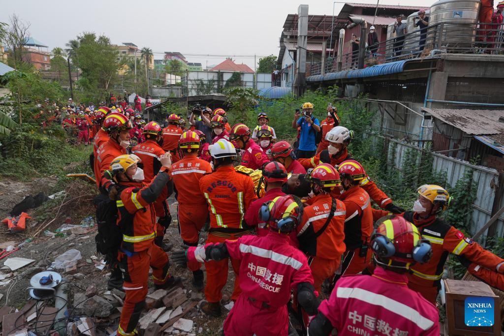 عمال الإنقاذ الصينيون ينتشلون ناجيًا آخر من تحت الأنقاض في ماندالاي المنكوبة بميانمار