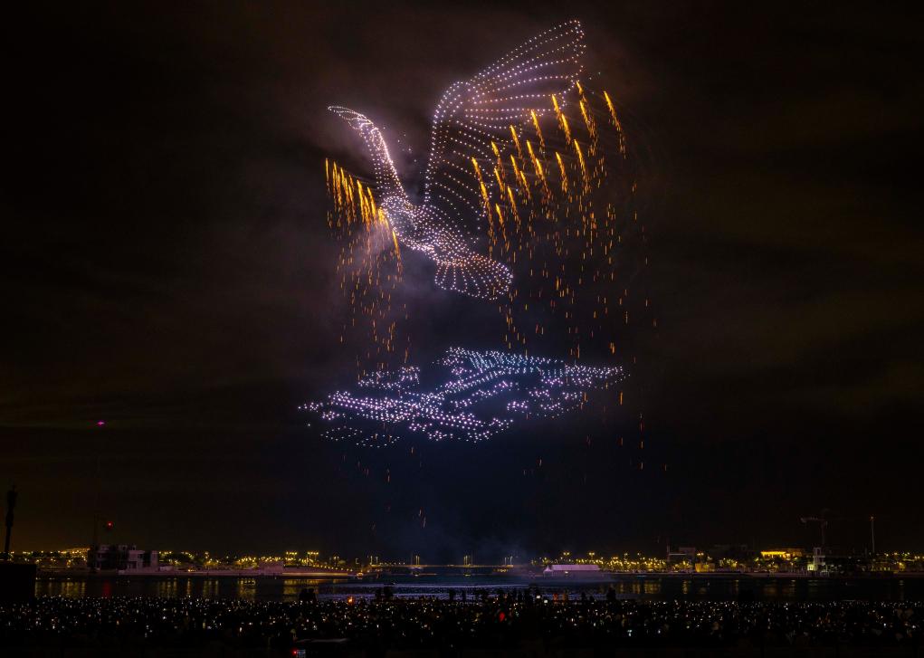 لوسيل 4 أبريل 2025 (شينخوا) في الصورة الملتقطة يوم 3 أبريل 2025، مشهد لعرض ضوئي بطائرة بدون طيار خلال فعاليات مهرجان "سماء لوسيل" في إطار الاحتفال بعيد الفطر في مدينة لوسيل بقطر.