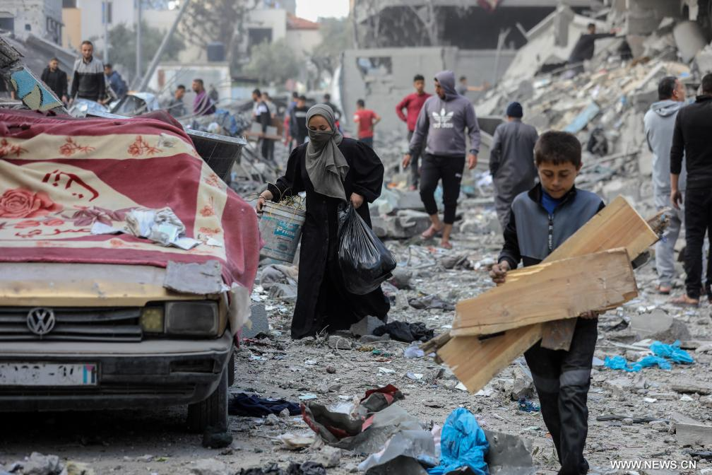 غزة 4 أبريل 2025 (شينخوا) في الصورة الملتقطة يوم 4 أبريل 2025، أشخاص في مدرسة دار الأرقم في مدينة غزة - وهي مدرسة تحولت إلى مأوى للنازحين - بعد غارة جوية إسرائيلية.