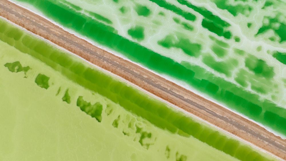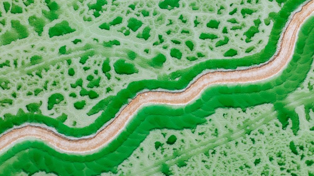 مانغيا 22 أبريل 2025 (شينخوا) في الصورة الملتقطة جوا يوم 19 أبريل 2025، منظر خلاب لـ "بحيرة اليشم" في مانغيا بولاية هايشي المنغولية والتبتية ذاتية الحكم في مقاطعة تشينغهاي شمال غربي الصين، حيث تأخذ بحيرة اليشم عددا من الألوان بسبب الاختلاف في عمقها وتركيز المعادن في المياه، ما يجعلها بقعة ذات مناظر طبيعية خلابة.