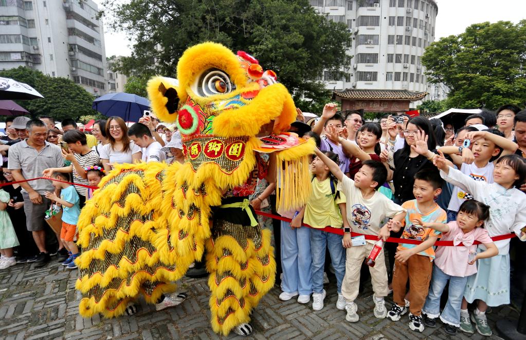 بكين 4 مايو 2025 (شينخوا) في الصورة الملتقطة يوم 2 مايو 2025، زوار يتفاعلون مع عرض "الأسد المستيقظ" التقليدي في مدينة فوهشان بمقاطعة قوانغدونغ في جنوبي الصين. وخلال عطلة عيد العمال، استمتع الناس بأوقاتهم من خلال مجموعة متنوعة من الأنشطة الترفيهية المبهجة.