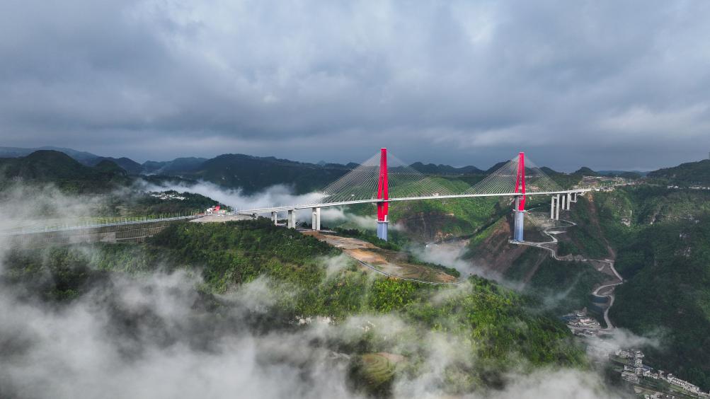 لونغلي 5 مايو 2025 (شينخوا) في الصورة الملتقطة جوا يوم 4 مايو 2025، منظر جوي خلاب لجسر نهر لونغلي الضخم في محافظة لونغلي بمقاطعة قويتشو في جنوب غربي الصين الذي يبلغ إجمالي طوله 1260 مترا.