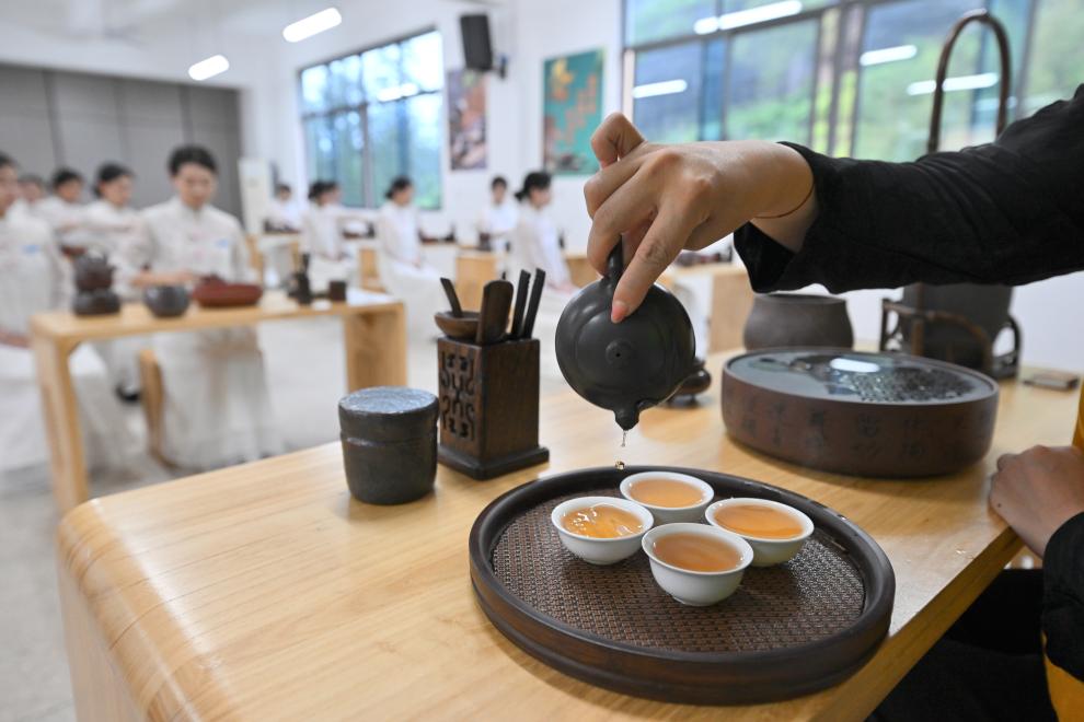 ووييشان 10 مايو 2025 (شينخوا) في الصورة الملتقطة يوم 8 مايو 2025، طالبات يتعلمن فن الشاي في مدرسة مهنية في مدينة ووييشان بمقاطعة فوجيان جنوب شرقي الصين.