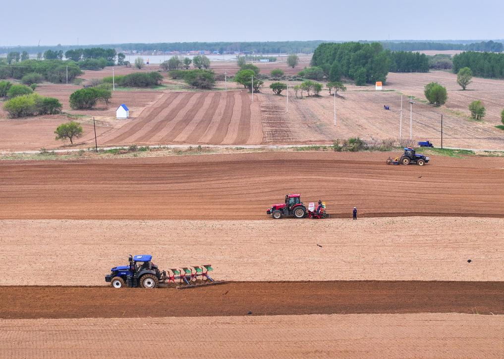 تونغلياو 12 مايو 2025 (شينخوا) في الصورة الملتقطة جوا يوم 9 مايو 2025، جرارات مزودة بنظام "بيدو" للملاحة عبر الأقمار الاصطناعية تعمل على زراعة الذرة في حقول بقرية في مدينة تونغلياو بمنطقة منغوليا الداخلية ذاتية الحكم شمالي الصين.