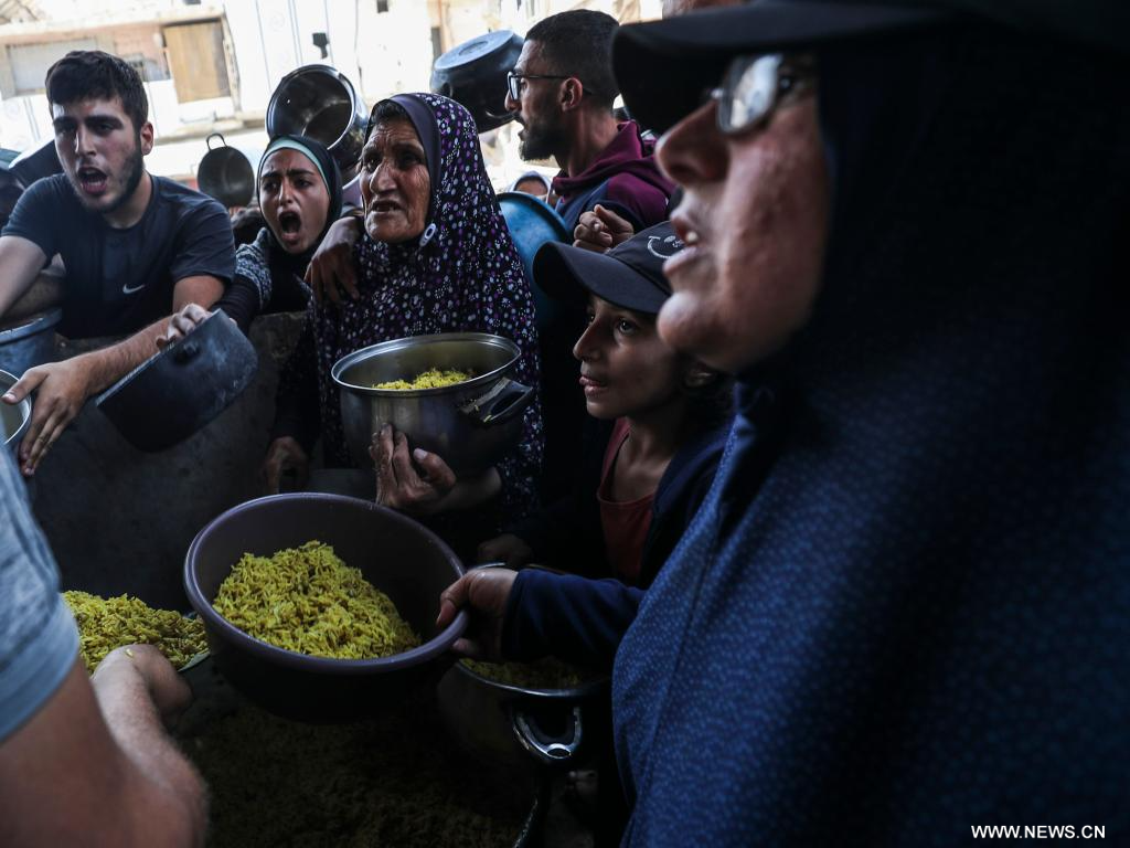 غزة 12 مايو 2025 (شينخوا) في الصورة الملتقطة يوم 11 مايو 2025، فلسطينيون يتلقون الطعام المجاني من مركز لتوزيع الطعام في مخيم جباليا للاجئين، شمالي قطاع غزة.