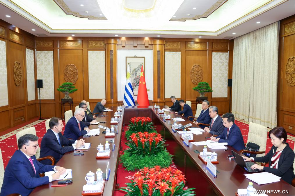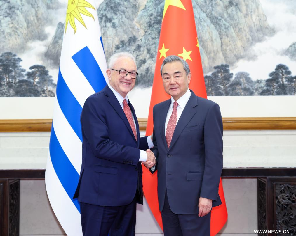 ولدى لقائه وزير خارجية أوروجواي ماريو لوبيتكين، أعرب وانغ عن استعداد الصين للعمل مع أوروجواي لتعميق التعاون عالي الجودة في إطار الحزام والطريق، وإثراء محتوى الشراكة الاستراتيجية الشاملة بين الصين وأوروجواي باستمرار من خلال ثقة سياسية متبادلة أقوى وتعاون متبادل المنفعة على مستوى أعلى وتعاون أوثق متعدد الأطراف.