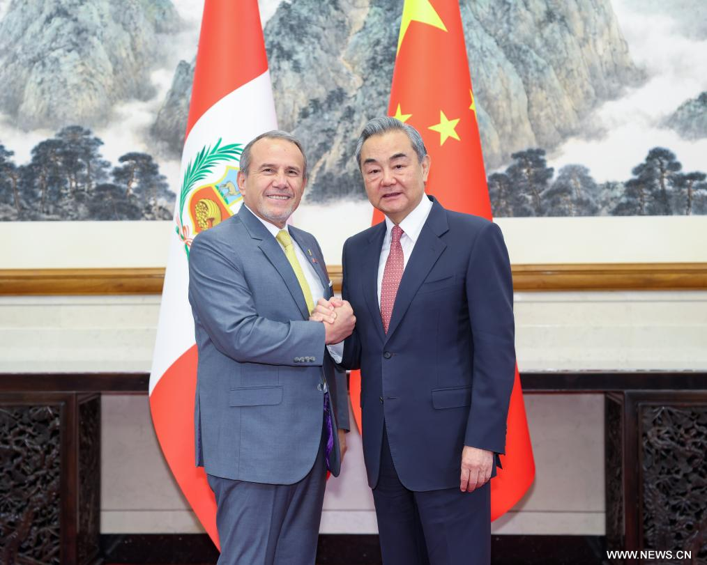 ولدى لقائه وزير الخارجية البيروفي إلمر شيالر سالسيدو، قال وانغ إن الرئيس شي ورئيسة بيرو دينا بولوارتي تبادلا الزيارة العام الماضي، معربا عن استعداد الصين لتنفيذ التوافق المهم الذي توصل إليه رئيسا الدولتين وتعزيز الشراكة الاستراتيجية الشاملة بين الصين وبيرو للوصول إلى آفاق جديدة باستمرار.