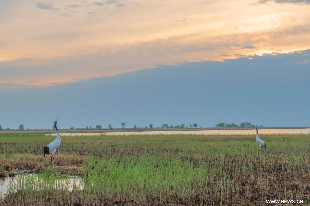 تشيتشيهار 16 مايو 2025 (شينخوا) في الصورة الملتقطة يوم 14 مايو 2025، عائلة من طيور الكركي أحمر التاج في محمية تشالونغ الوطنية الطبيعية في تشيتشيهار في مقاطعة هيلونغجيانغ بشمال شرقي الصين.