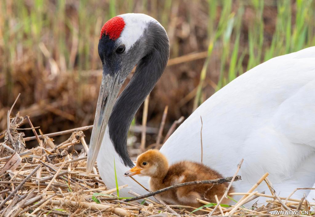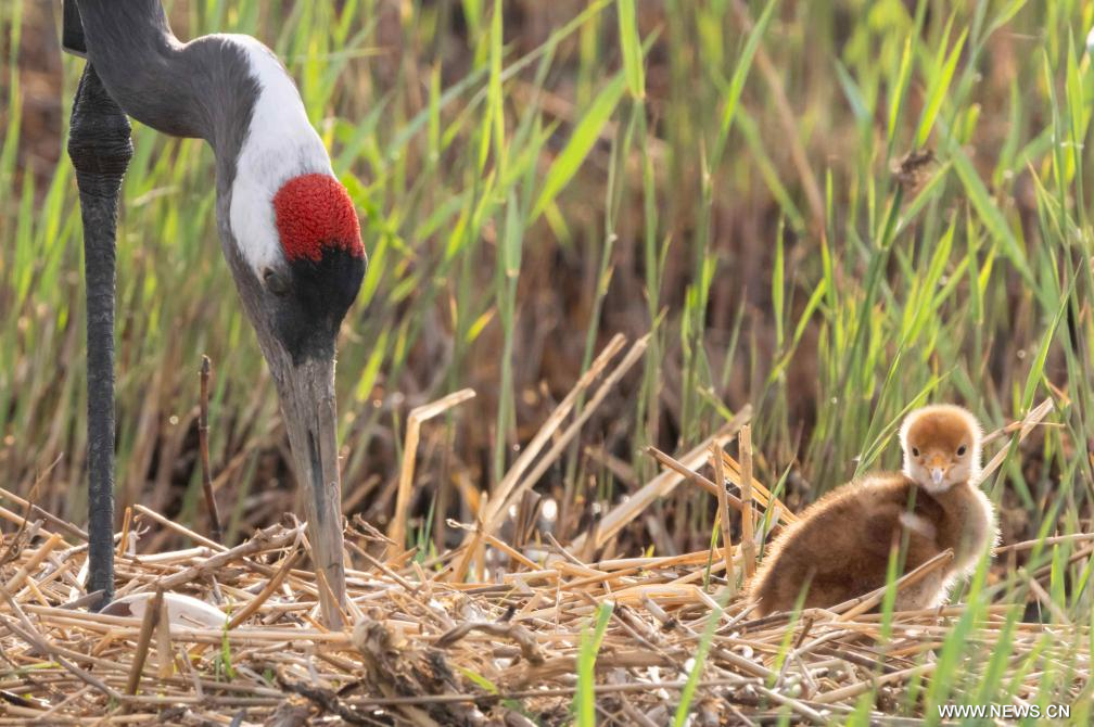 تشيتشيهار 16 مايو 2025 (شينخوا) في الصورة الملتقطة يوم 14 مايو 2025، طائر كركي أحمر التاج يرعى فرخا في محمية تشالونغ الوطنية الطبيعية في تشيشيهار في مقاطعة هيلونغجيانغ بشمال شرقي الصين.