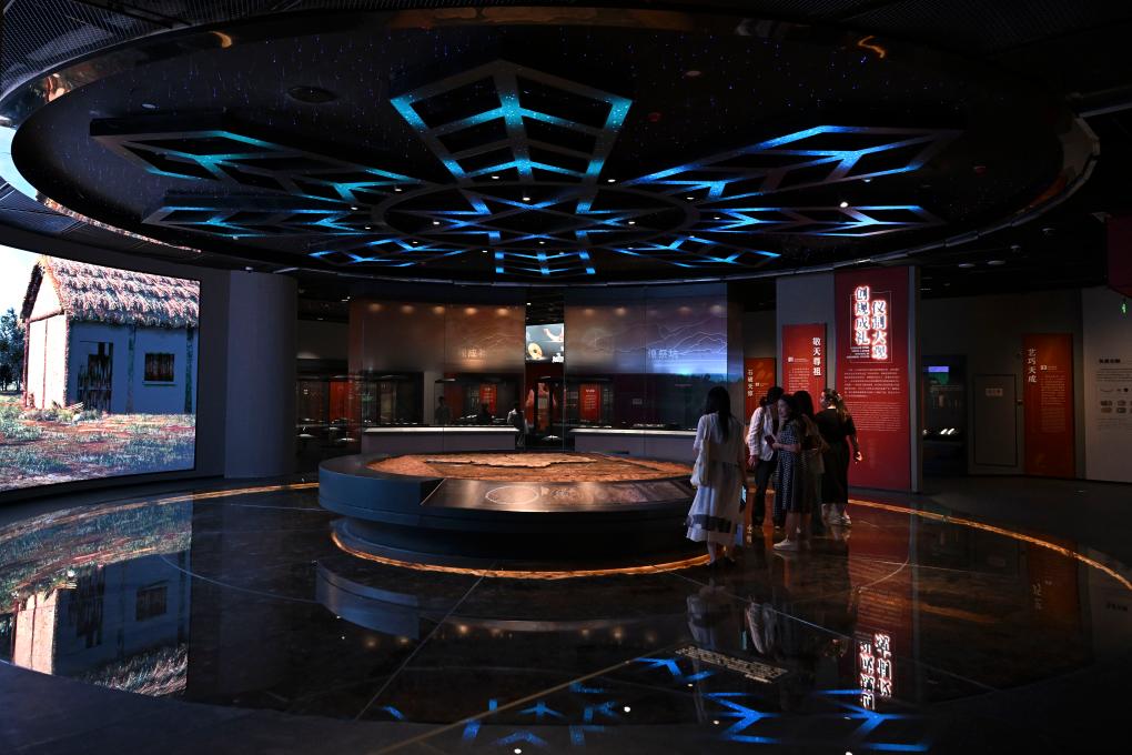 هانشان 17 مايو 2025 (شينخوا) في الصورة الملتقطة يوم 16 مايو 2025، زوار يشاهدون المعروضات في متحف موقع لينغجياتان في محافظة هانشان التابعة لمدينة مآنشان بمقاطعة آنهوي بشرقي الصين.