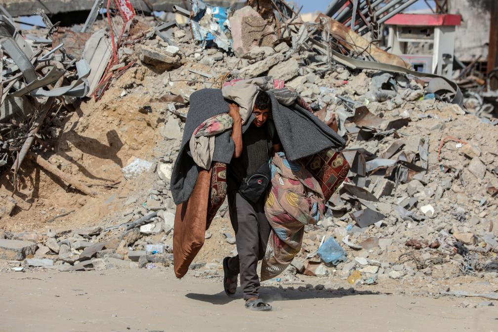 جباليا 20 مايو 2025 (شينخوا) في الصورة الملتقطة يوم 19 مايو 2025، فلسطيني يحمل أمتعته ويفر من بلدتي بيت لاهيا وجباليا شمالي قطاع غزة إلى وسط وغربي مدينة غزة بعد أوامر نزوح إسرائيلية، في منطقة جباليا، قطاع غزة.