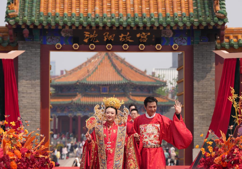شنيانغ 23 مايو 2025 (شينخوا) في الصورة الملتقطة يوم 22 مايو 2025، مشهد لحفل زفاف جماعي عقد في الساحة الجنوبية لقصر شنيانغ الإمبراطوري في مدينة شنيانغ، حاضرة مقاطعة لياونينغ بشمال شرقي الصين، حيث تزوج 52 زوجا بحضور أقاربهم وأصدقائهم.