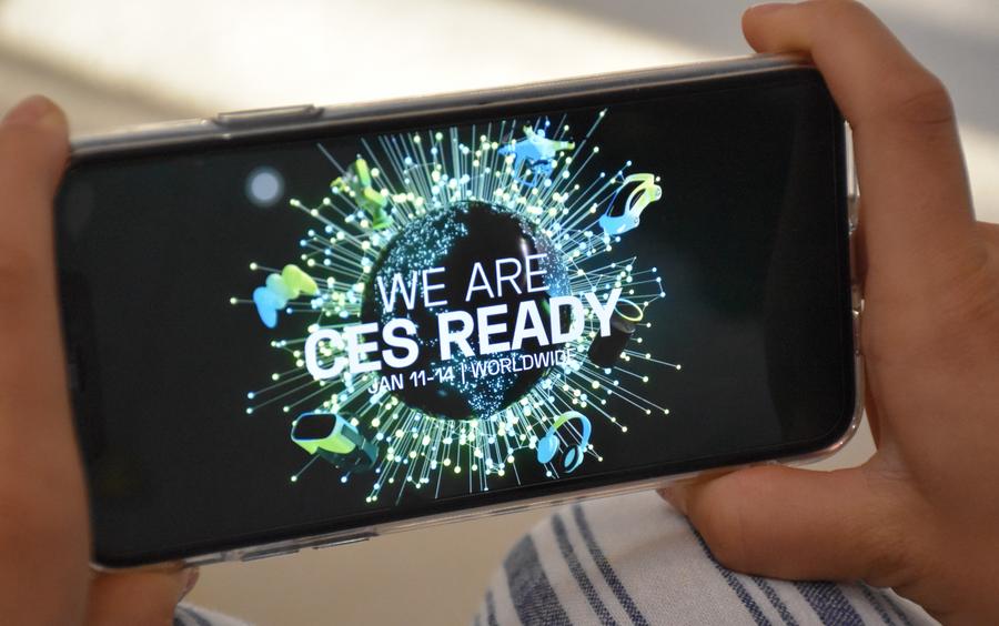 الصورة الملتقطة في لوس أنجليس، الولايات المتحدة في 11 يناير 2021 تظهر شاشة هاتف ذكي تعرض محتويات على الموقع الرسمي لمعرض الإلكترونيات الاستهلاكية لعام 2021. (شينخوا)