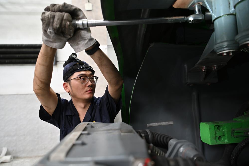 تاييوان 18 يونيو 2025 (شينخوا) في الصورة الملتقطة يوم 17 يونيو 2025، موظف يقوم بفحص وصيانة أحد القطارات في مستودع تابع لشركة مجموعة تاييوان المحدودة للسكك الحديدية الصينية في تاييوان بمقاطعة شانشي شمالي الصين. وكثف موظفو الشركة أعمال صيانة القطارات لضمان السفر الآمن خلال فترة الذروة الصيفية القادمة.