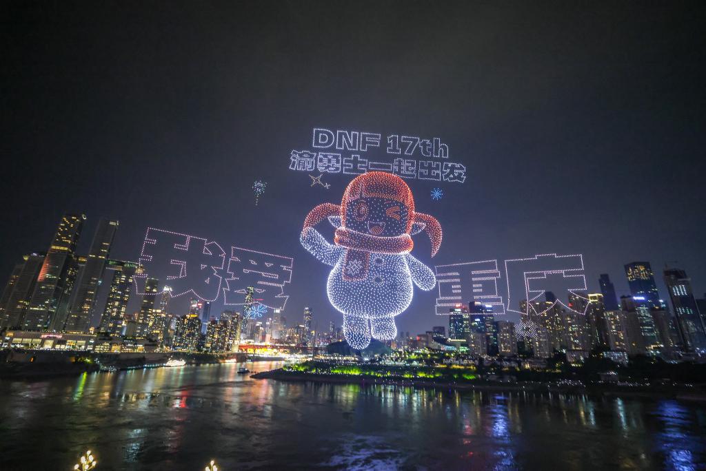 تشونغتشينغ 19 يونيو 2025 (شينخوا) في الصورة الملتقطة يوم 17 يونيو 2025، مشهد من عرض ضوئي بطائرات دون طيار في بلدية تشونغتشينغ بجنوب غربي الصين.