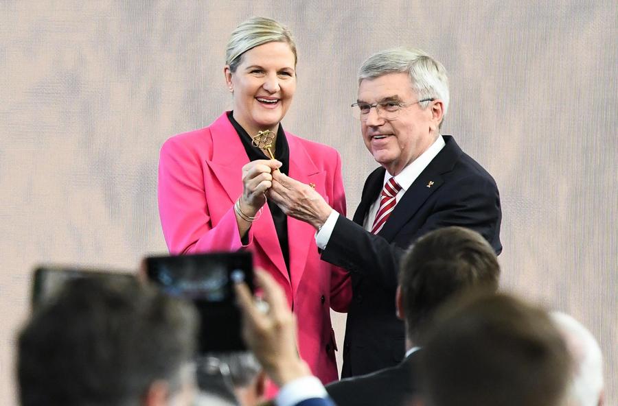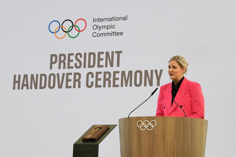 الزيمبابوبة كيرستي كوفنتري تتسلم رئاسة اللجنة الأولمبية الدولية من توماس باخ يوم الاثنين، الموافق 23 يونيو 2025، في مقر اللجنة الأولمبية الدولية بمدينة لوزان السويسرية. (شينخوا)