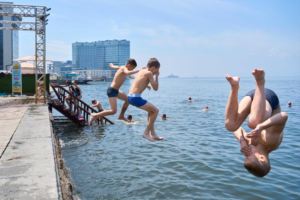 فلاديفوستوك 29 يونيو 2025 (شينخوا) في الصورة الملتقطة يوم 27 يونيو 2025، غلمان يقفزون في البحر لتلطيف حرارة أجسامهم، في مدينة فلاديفوستوك الروسية التي شهدت موجة حر شديدة يوم الجمعة.