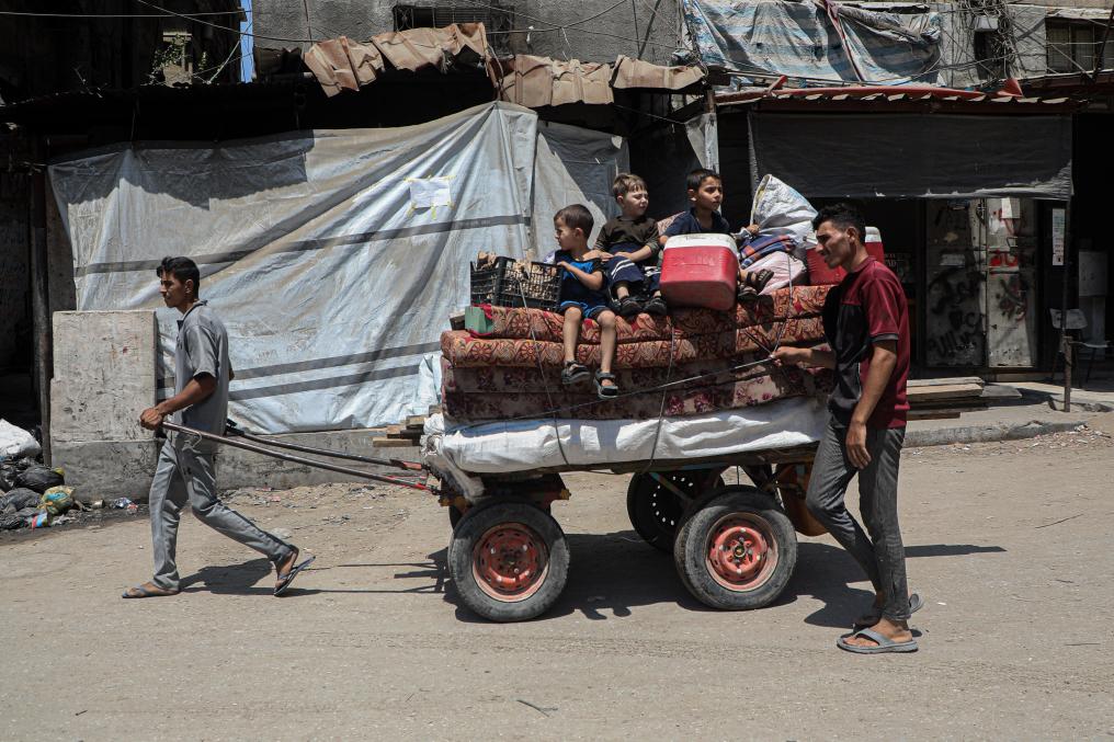 مدينة غزة 30 يونيو 2025 (شينخوا) في الصورة الملتقطة يوم 29 يونيو 2025، فلسطينيون يحملون أمتعتهم ويفرون من حي التفاح شرقي مدينة غزة.