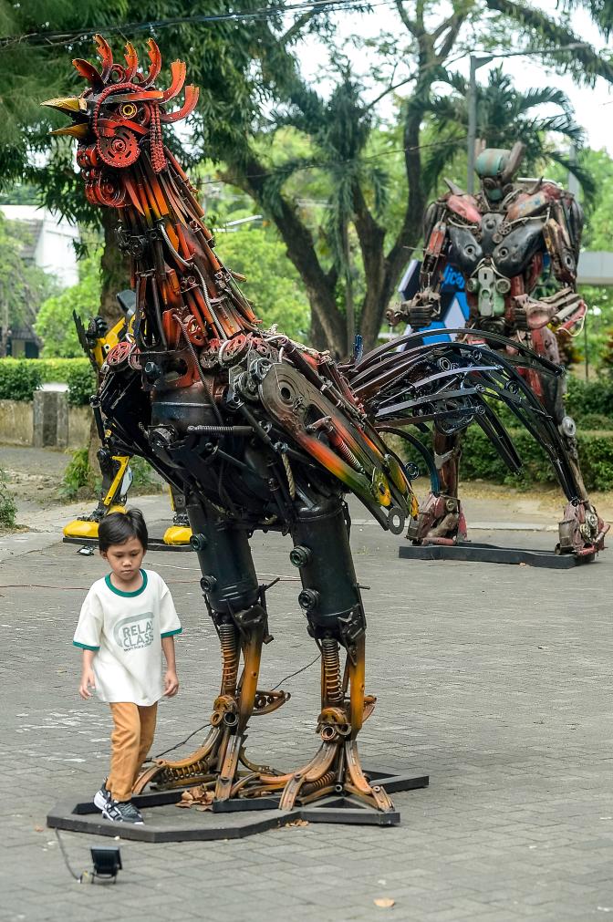 يوجياكارتا 6 يوليو 2025 (شينخوا) في الصورة الملتقطة يوم 6 يوليو 2025، طفل يمر بجوار مجسم فني ضمن فعاليات مهرجان الفن الإبداعي في مدينة يوجياكارتا بإندونيسيا.