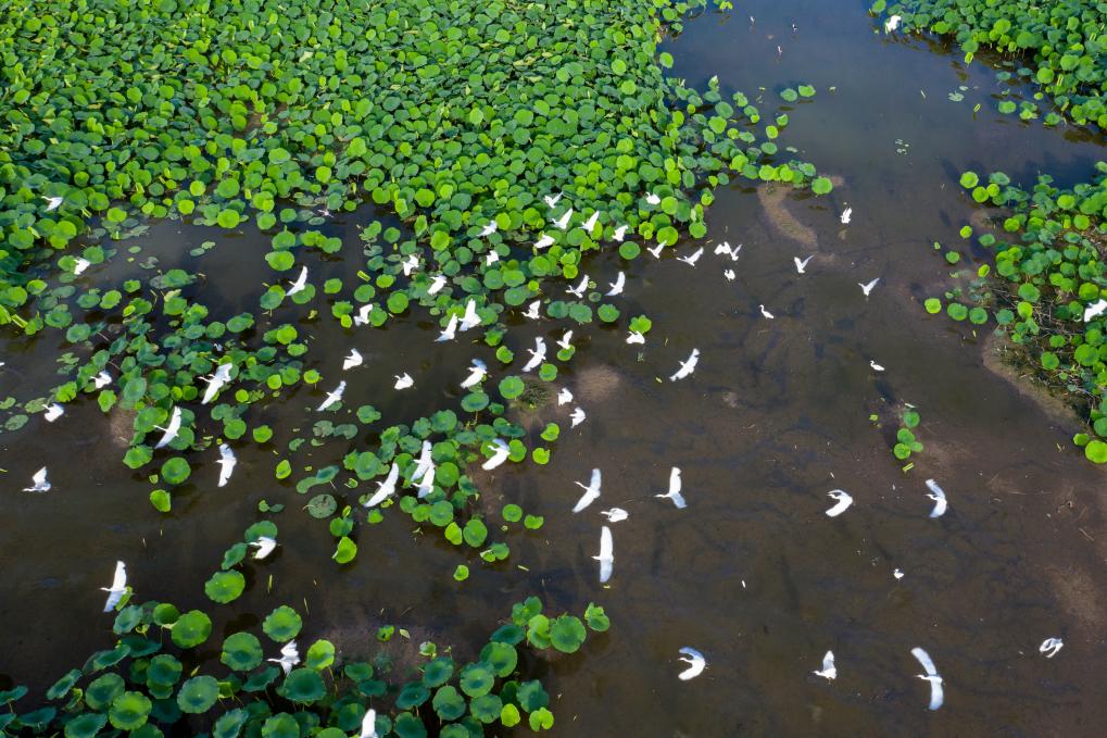بكين 6 يوليو 2025 (شينخوا) في الصورة الملتقطة يوم 5 يوليو 2025، طيور مالك الحزين تحلق فوق بركة لوتس في بلدة تشانغجيا بمحافظة قاوتشينغ في مقاطعة شاندونغ بشرقي الصين.