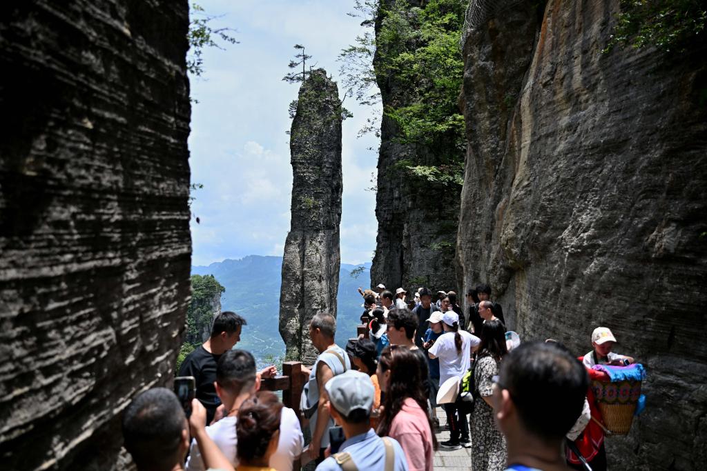 أنشي 12 يوليو 2025 (شينخوا) في الصورة الملتقطة يوم 10 يوليو 2025، سياح يستمتعون بمنظر "الأخدود الكبير في أنشي" في ولاية أنشي ذاتية الحكم لقوميتي توجيا و مياو بمقاطعة هوبي في وسط الصين.