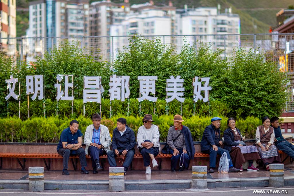 لاسا 17 يوليو 2025 (شينخوا) في الصورة الملتقطة يوم 21 يونيو 2025، أناس يستريحون في ساحة بمدينة تشامدو في منطقة شيتسانغ ذاتية الحكم بجنوب غربي الصين.