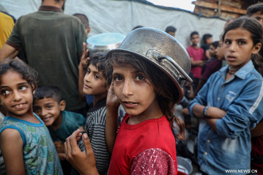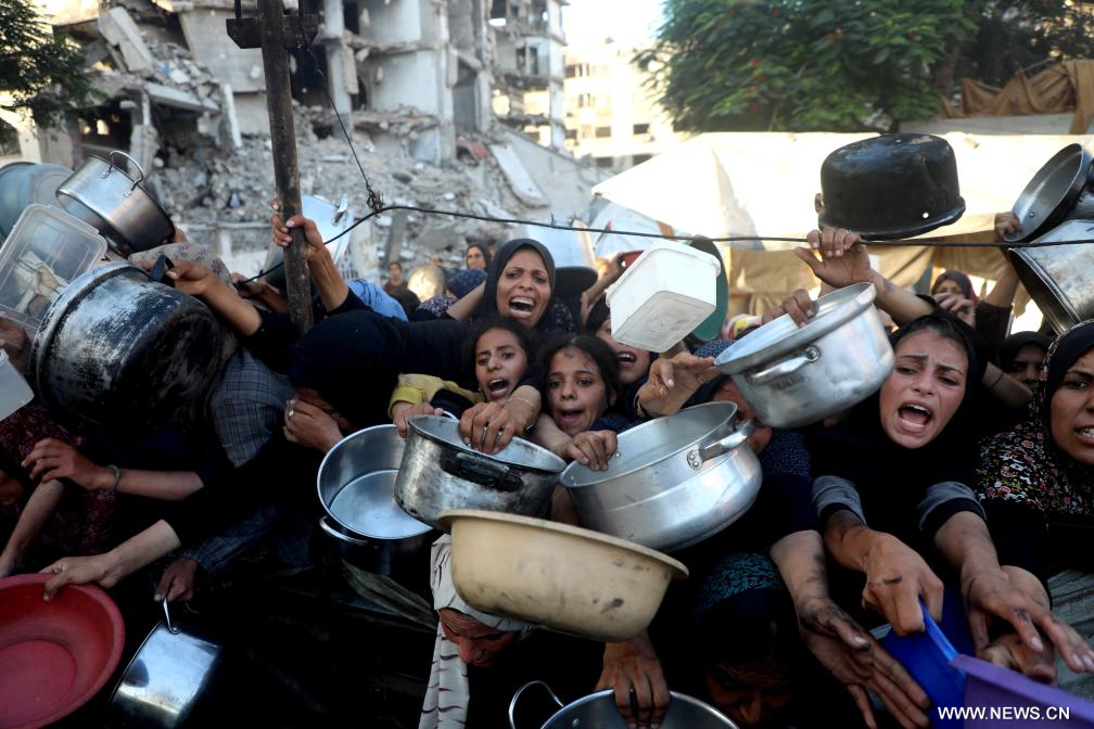 مدينة غزة 21 يوليو 2025 (شينخوا) في الصورة الملتقطة يوم 20 يوليو 2025، فلسطينيون ينتظرون من أجل الحصول على طعام في حي الرمال وسط مدينة غزة.