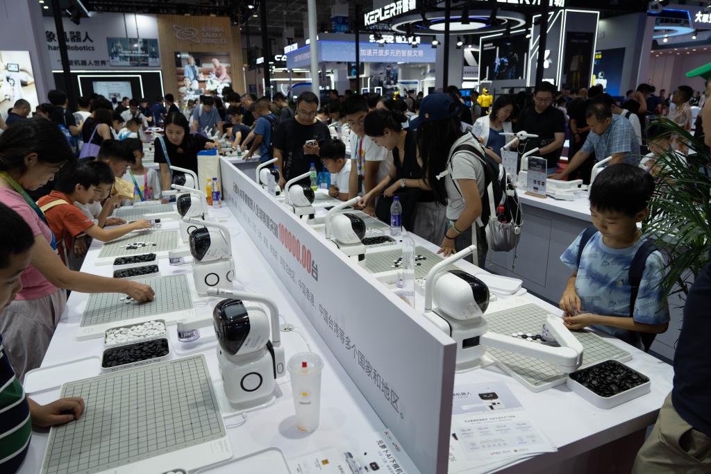 بكين 9 أغسطس 2025 (شينخوا) في الصورة الملتقطة يوم 8 أغسطس 2025، زوار يتنافسون مع روبوتات في مؤتمر الروبوتات العالمي 2025 في العاصمة الصينية بكين.