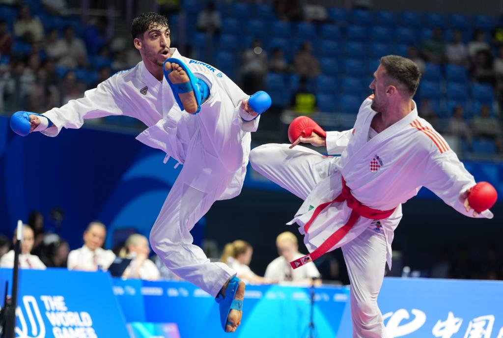تشنغدو 10 أغسطس 2025 (شينخوا) في الصورة الملتقطة يوم 9 أغسطس 2025، محمد فائق محمد الجعفري (إلى اليسار) من الأردن يتنافس مع لاعب كرواتي خلال النزال النهائي على الميدالية الذهبية في منافسات الكوميتيه لوزن تحت 84 كغم للرجال ضمن رياضة الكاراتيه في دورة الألعاب العالمية 2025 بمدينة تشنغدو، حاضرة مقاطعة سيتشوان جنوب غربي الصين.
