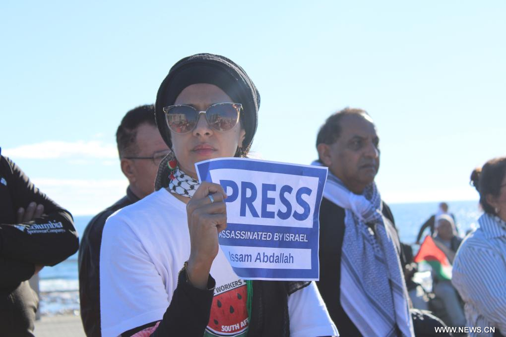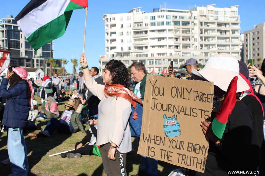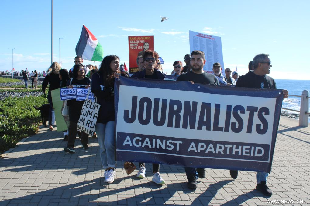 كيب تاون 17 أغسطس 2025 (شينخوا) قاد صحفيون وعاملون في الإعلام بجنوب أفريقيا مسيرة في منطقة سيبوينت بكيب تاون يوم الأحد، للمطالبة بتوفير المزيد من الحماية للصحفيين الفلسطينيين في غزة والتعبير عن تضامنهم مع زملائهم الذين قُتلوا.