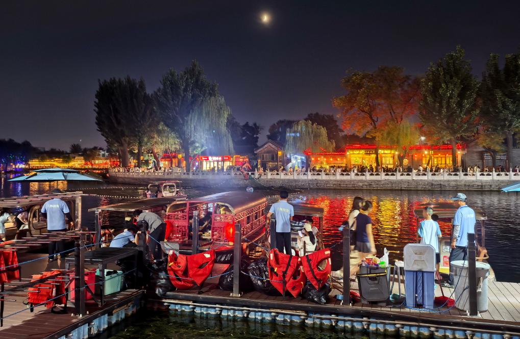 في الصورة الملتقطة يوم 30 يوليو 2025، سياح يركبون قوارب لزيارة بحيرة هوهاي ليلا في بكين. (شينخوا)