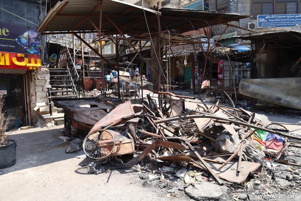 في الصورة الملتقطة يوم 14 أغسطس 2025، مشاهد للدمار والأضرار التي لحقت بالمتاجر بعد الصراع الأخير في مدينة السويداء، سوريا.