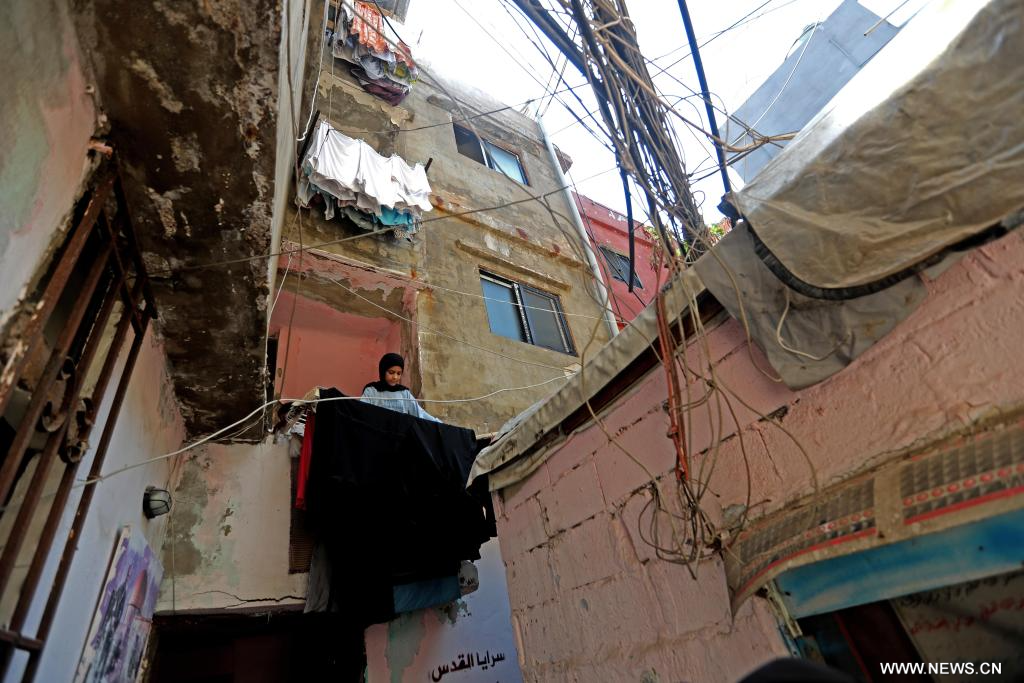 في الصورة الملتقطة يوم 14 أغسطس 2025، فتاة تنشر الملابس بعد غسلها لتجف في أحد أزقة مخيم برج البراجنة للاجئين الفلسطينيين قرب بيروت، لبنان.