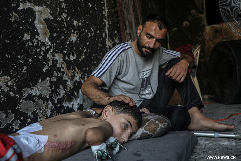في الصورة الملتقطة يوم 14 أغسطس 2025، سمير زقوت، طفل فلسطيني يبلغ من العمر 11 عاما، وفقد ذراعه اليمنى وساقه اليسرى في غارة جوية إسرائيلية، يقيم مع أحد أفراد عائلته في منزله في مدينة غزة.