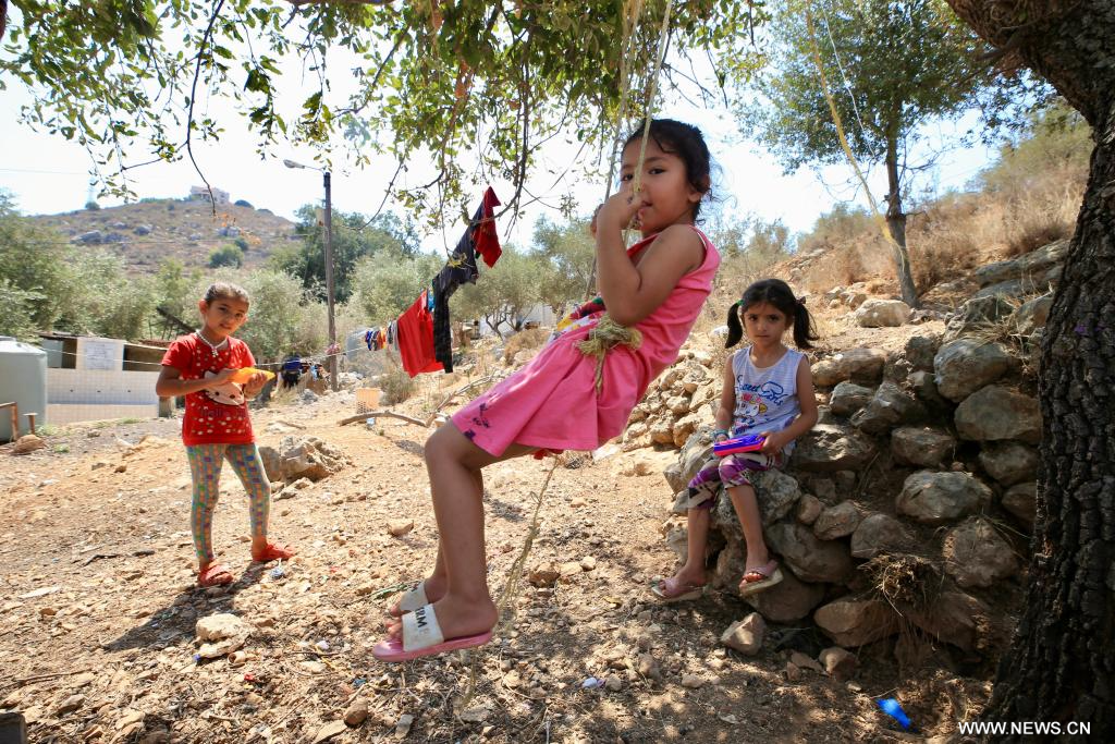 في الصورة الملتقطة يوم 14 أغسطس 2025، أطفال سوريون لاجئون يلعبون داخل مخيم للاجئين في بلدة كترمايا بلبنان.
