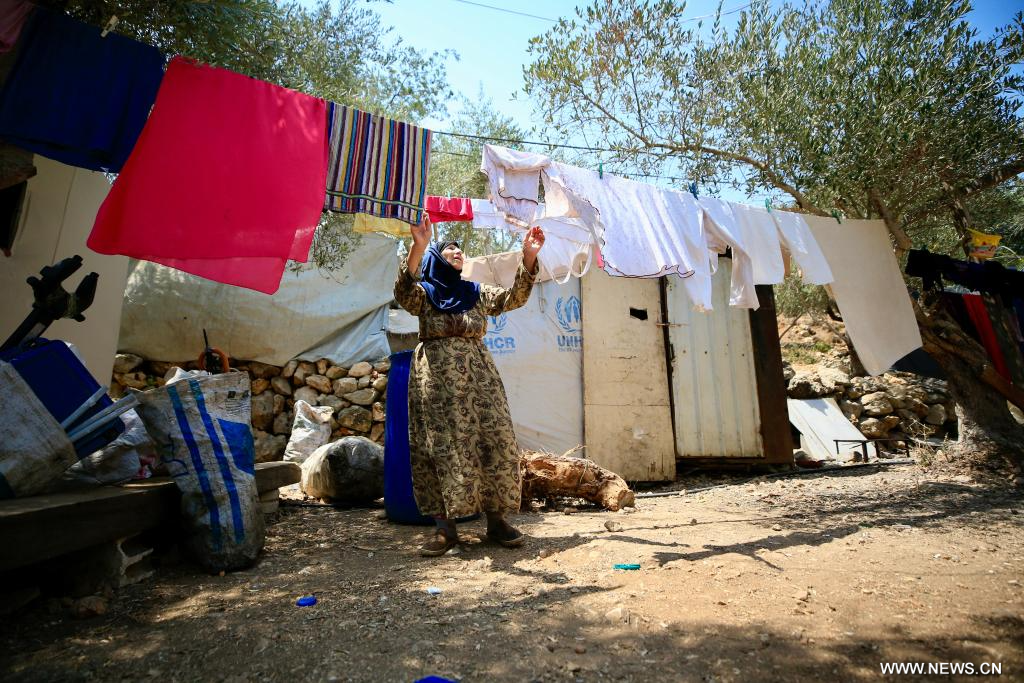 في الصورة الملتقطة يوم 14 أغسطس 2025، لاجئة سورية تجفف ملابسها في مخيم للاجئين السوريين في بلدة كترمايا بلبنان.