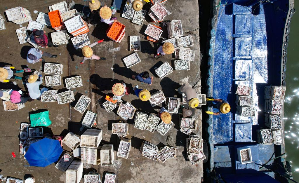 ونتشانغ 22 أغسطس 2025 (شينخوا) في الصورة الملتقطة يوم 21 أغسطس 2025، أسماك تم تفريغها وتداولها في ميناء صيد في مدينة ونتشانغ بمقاطعة هاينان بجنوبي الصين. هذا وعادت قوارب الصيد في هاينان محملة بكميات وفيرة من الأسماك بعد رفع حظر الصيد الموسمي الأسبوع الماضي في بحر الصين الجنوبي.