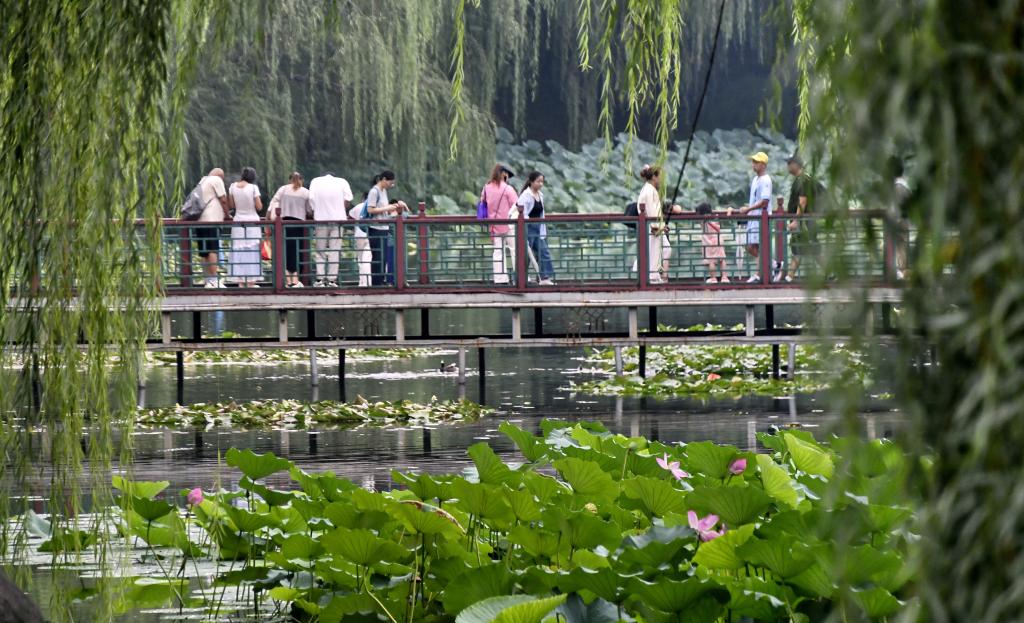 بكين 23 أغسطس 2025 (شينخوا) في الصورة الملتقطة يوم 21 أغسطس 2025، زوار يتمتعون بمناظر زهور اللوتس المتفتحة في حديقة يوانمينغيوان بالعاصمة الصينية بكين، وتتفتح الزهور في المدينة مع بداية الخريف.
