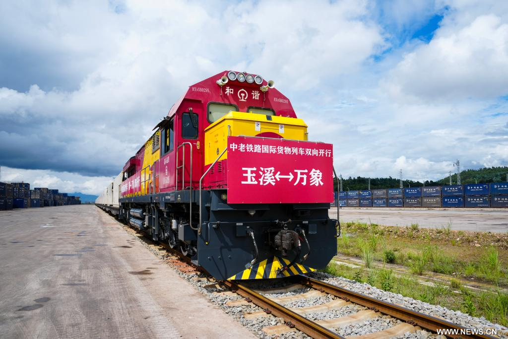 يويشي 25 أغسطس 2025 (شينخوا) في الصورة الملتقطة يوم 23 أغسطس 2025، قطار شحن دولي متجه إلى العاصمة اللاوسية، فينتيان، يستعد للانطلاق من محطة يانخه لخط السكك الحديدية بين الصين ولاوس في مدينة يويشي بمقاطعة يوننان جنوب غربي الصين.