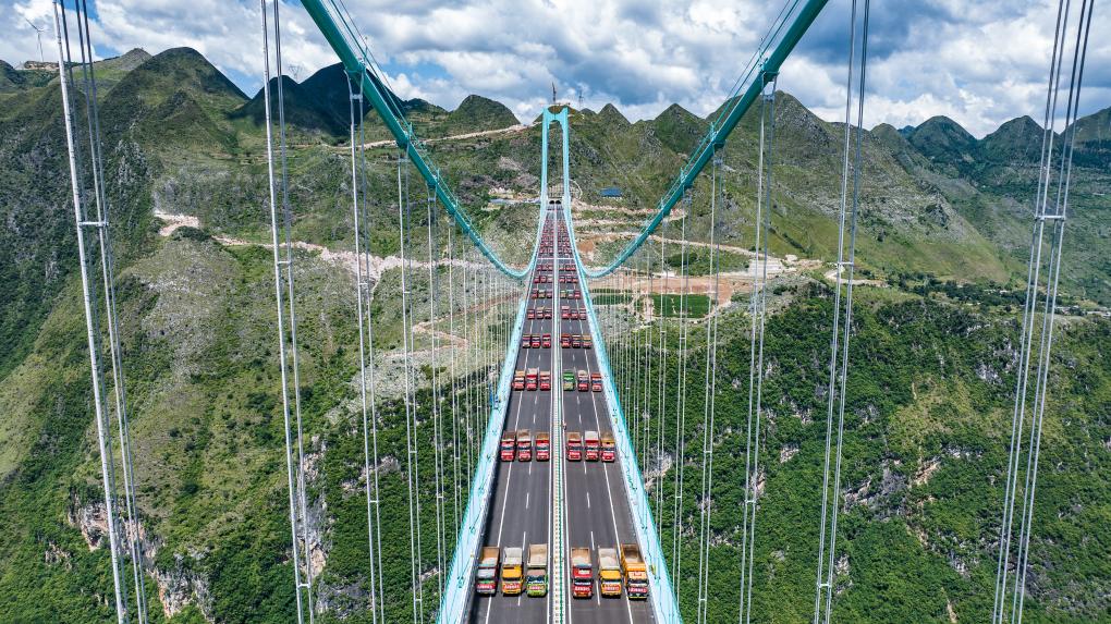 تشنفنغ 26 أغسطس 2025 (شينخوا) في الصورة الملتقطة يوم 25 أغسطس 2025، جانب من اختبار التحميل لجسر "هواجيانغ جراند كانيون" في مقاطعة قويتشو بجنوب غربي الصين، وذلك قبل افتتاحه المقرر في أواخر سبتمبر المقبل.