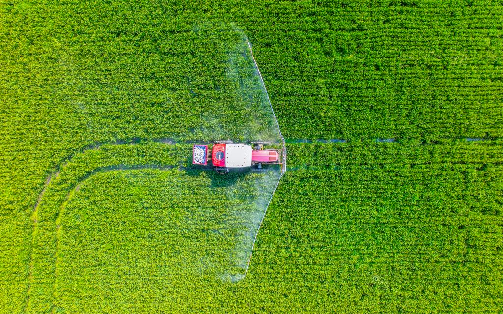 بكين 7 سبتمبر 2025 (شينخوا) في الصورة الملتقطة يوم 6 سبتمبر 2025، فلاح يشغل مركبة لرش المبيدات في حقل للأرز بمدينة هايآن بمقاطعة جيانغسو بشرقي الصين.
