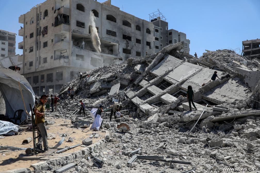 مدينة غزة 11 سبتمبر 2025 (شينخوا) في الصورة الملتقطة يوم 10 سبتمبر 2025، فلسطينيون يتفقدون الأضرار التي لحقت ببرج طيبة المكون من 11 طابقا بعد غارة جوية إسرائيلية غربي مدينة غزة.