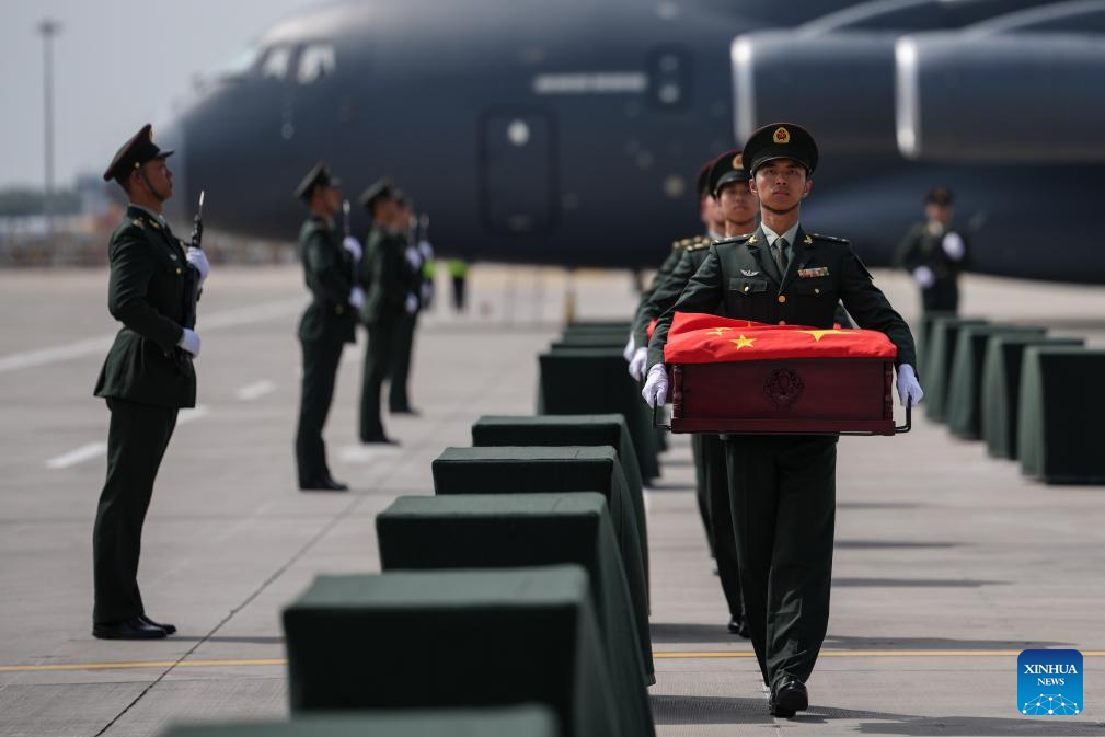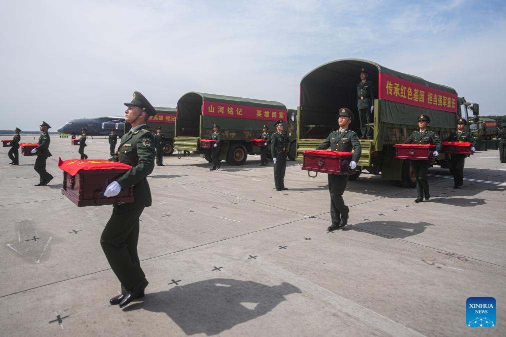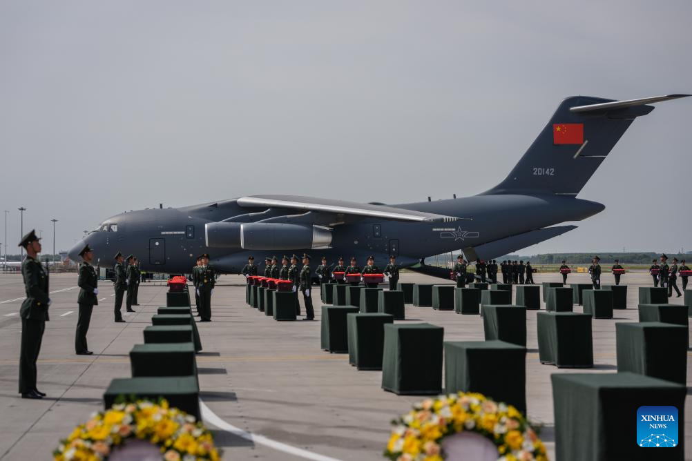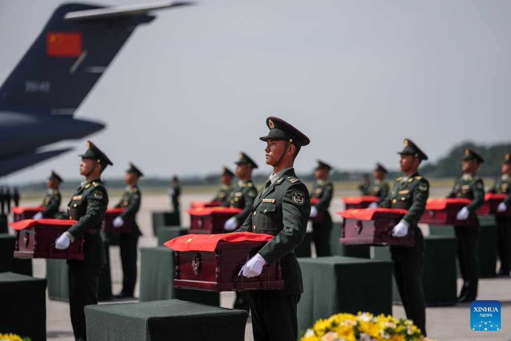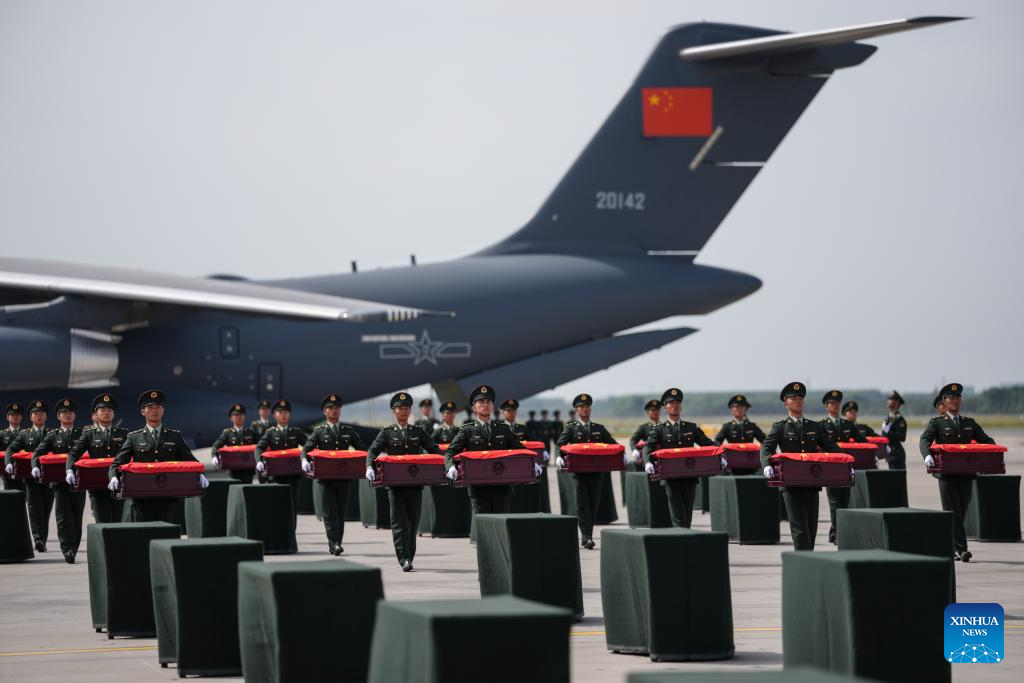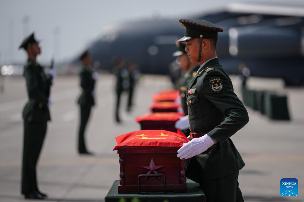 وهبطت طائرة نقل تابعة للقوات الجوية لجيش التحرير الشعبي الصيني من طراز "واي-20"، حاملة على متنها رفات الجنود الشهداء و267 قطعة من متعلقاتهم الشخصية، في مطار تاوشيان الدولي في مدينة شنيانغ حاضرة مقاطعة لياونينغ بشمال شرقي الصين.