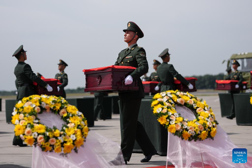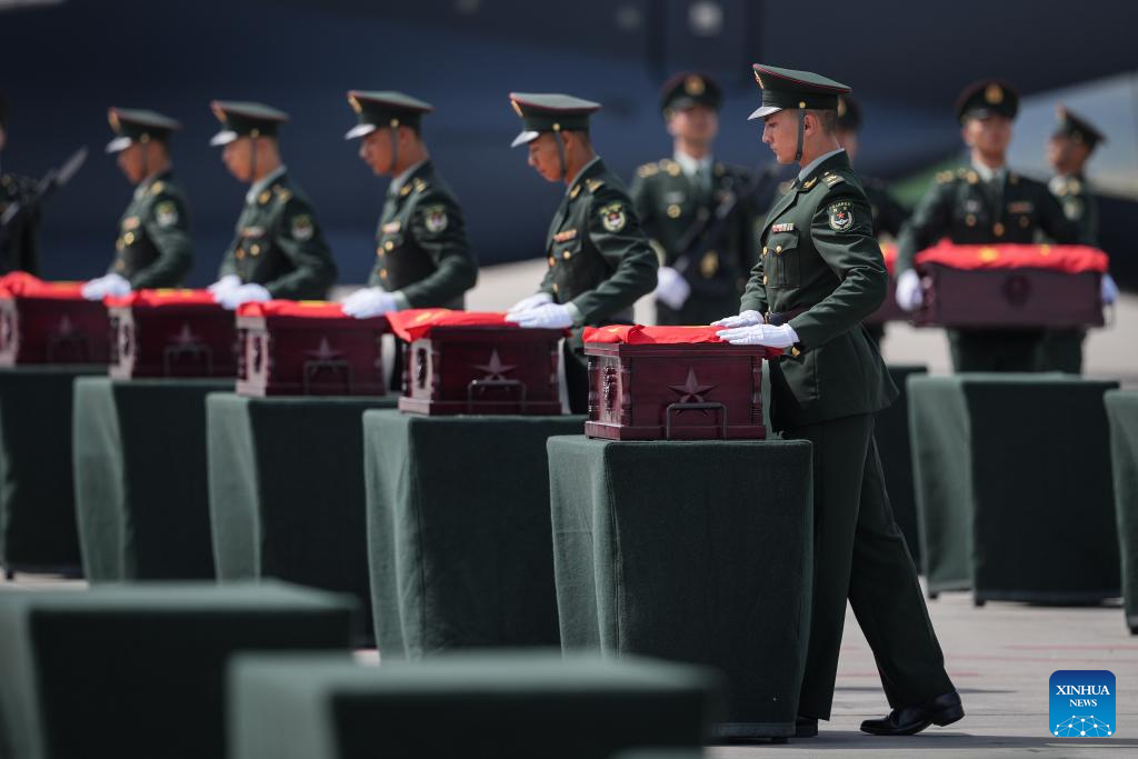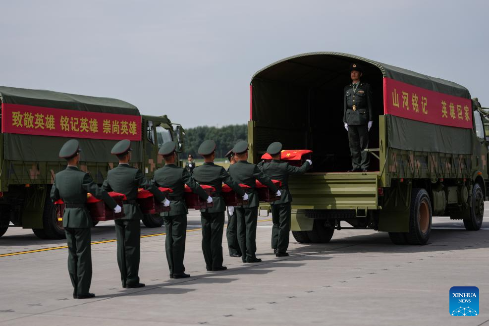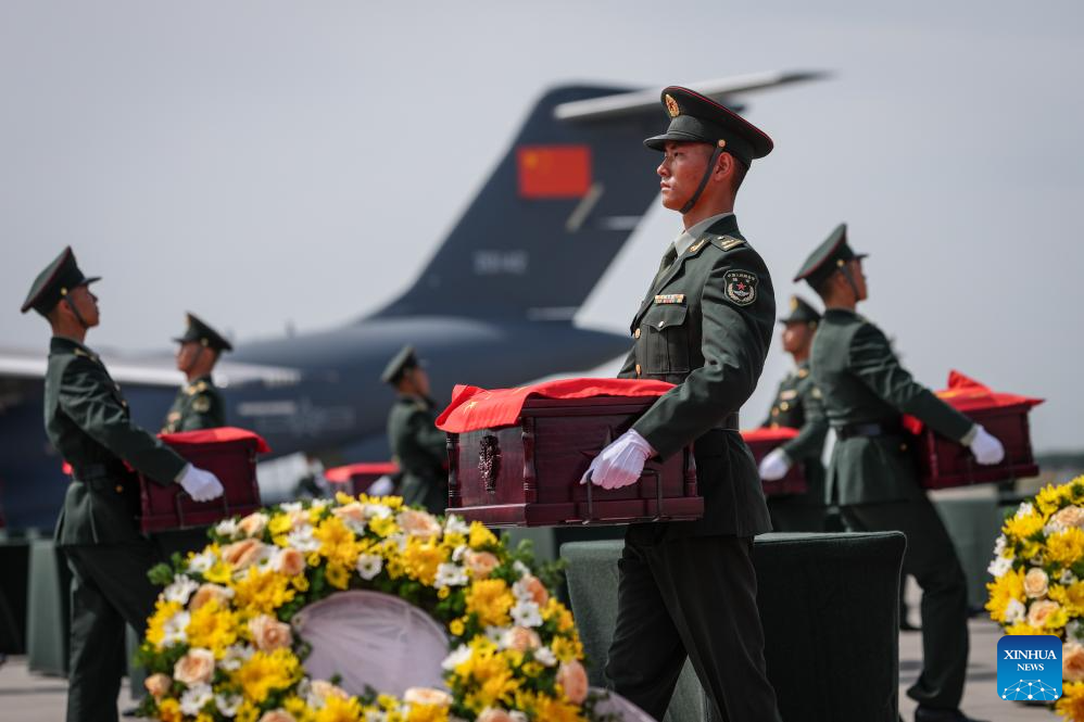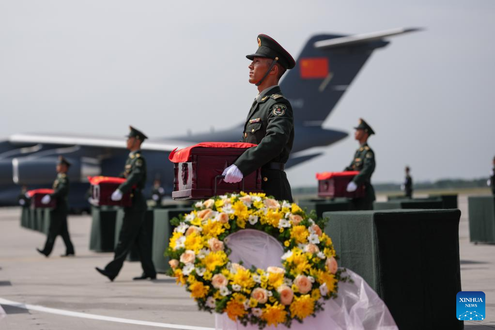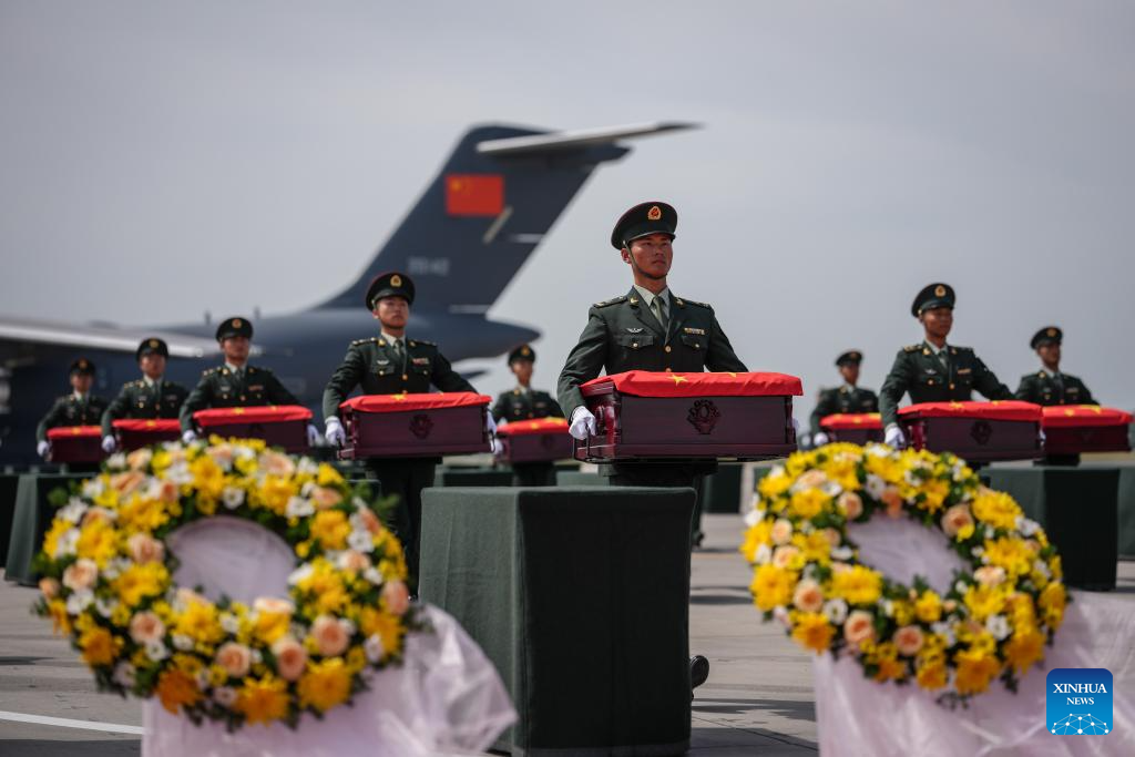 وهبطت طائرة نقل تابعة للقوات الجوية لجيش التحرير الشعبي الصيني من طراز "واي-20"، حاملة على متنها رفات الجنود الشهداء و267 قطعة من متعلقاتهم الشخصية، في مطار تاوشيان الدولي في مدينة شنيانغ حاضرة مقاطعة لياونينغ بشمال شرقي الصين.