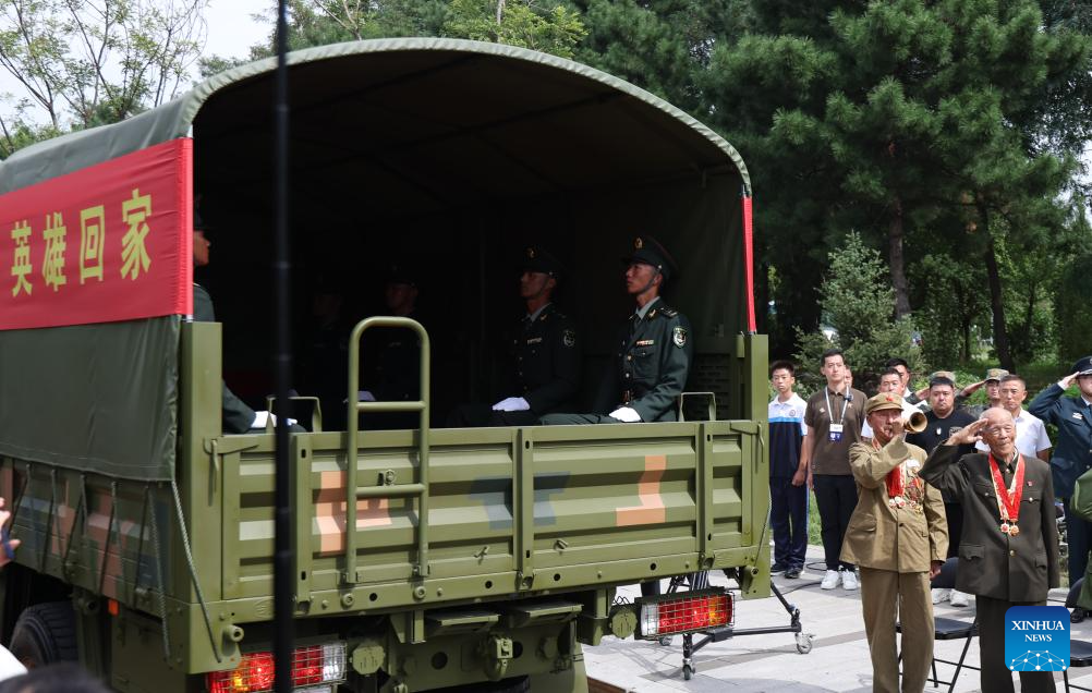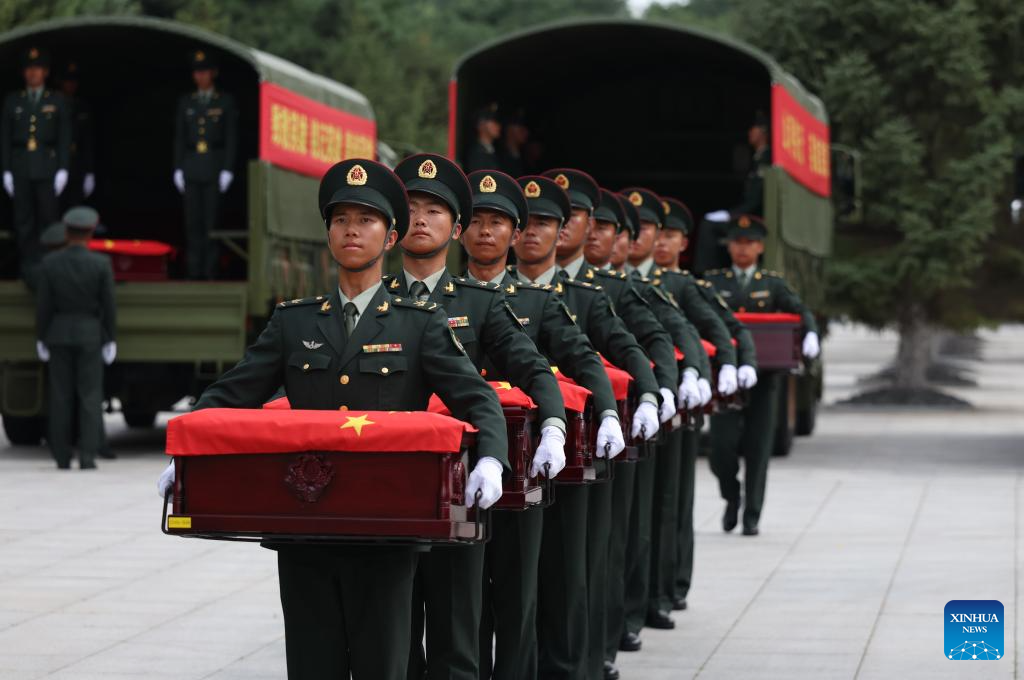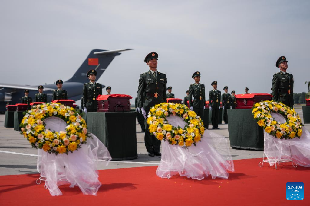 بكين 12 سبتمبر 2025 (شينخوا) تمت إعادة رفات ثلاثين جنديا من متطوعي الشعب الصيني ممن استشهدوا في حرب مقاومة العدوان الأمريكي ومساعدة كوريا (1950 - 1953) إلى الصين اليوم الجمعة من جمهورية كوريا.