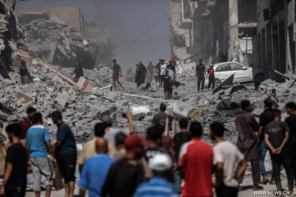 مدينة غزة 13 سبتمبر 2025 (شينخوا) في الصورة الملتقطة يوم 12 سبتمبر 2025، فلسطينيون يتفقدون الأضرار التي لحقت بالعديد من المنازل في حي النصر بمدينة غزة بعد غارة جوية إسرائيلية.
