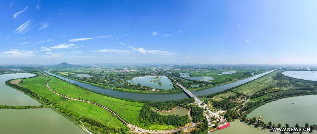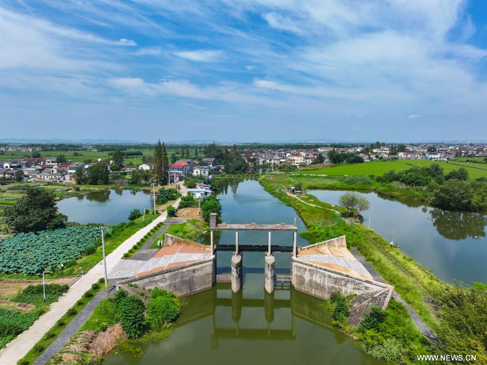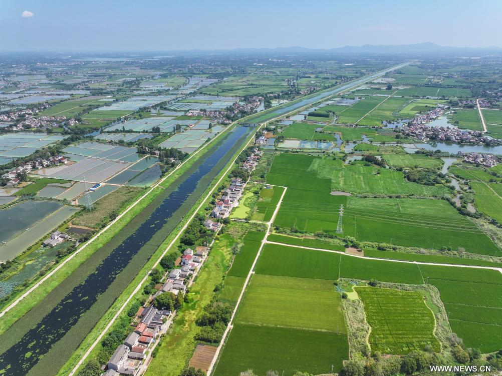 نانجينغ 16 سبتمبر 2025 (شينخوا) في الصورة الملتقطة يوم 15 سبتمبر 2025، منظر لمنطقة مروية بنظام الري لبحيرة تشيشان في مدينة جيويرونغ في مقاطعة جيانغسو شرقي الصين.